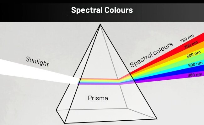 When white light hits a prism, the spectral colours are created, but what happens when the spectral colour hits a prism again? Does the human eye recognise new colour changes? Spectral colours are pure colours, i.e. they cannot be broken down into other colours. If the experiment with the prism were repeated with spectral colours instead of white light, no new colours would be created.